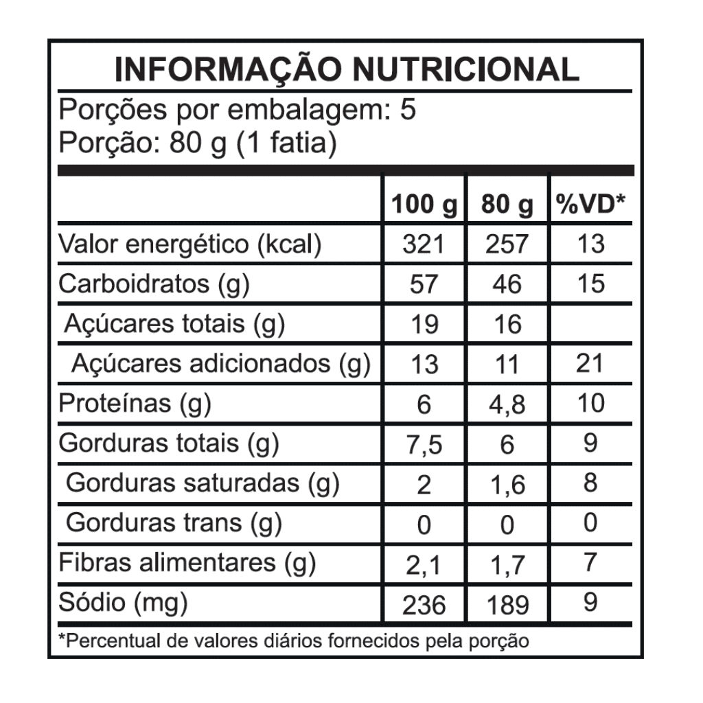 Ingredientes: farinha de trigo enriquecida com ferro e ácido fólico, açúcar, frutas cristalizadas, uva passa, óleo de soja transgênico (Agrobacterium tumefaciens), ovo integral desidratado, glúten, sal, emulsificantes INS 322(i), INS 471, INS 433 e INS 482, melhoradores de farinha INS 300 e INS 927a, umectantes INS 420(i) e INS 422, conservante INS 282, corante INS 160b(ii) e aromatizante.